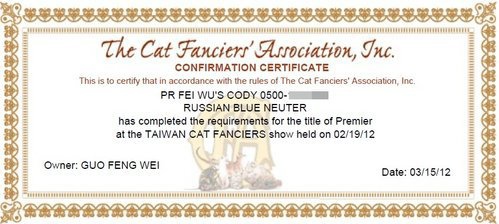 飛舞很榮幸的培育出台灣第一隻擁有GP頭銜的俄羅斯藍貓